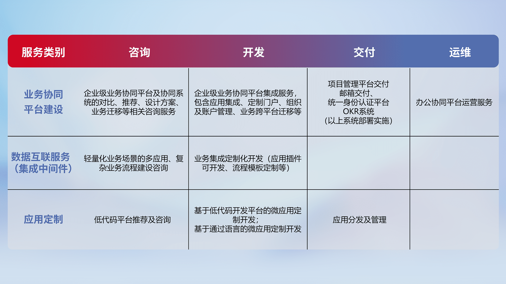 针对钉钉、、企微、、、IDaas等平台级产品提供产品的规划、、方案、、交付、、、、定制化开发等服务,,,实现如统一协同办公、、、智能客户服务、、混合会议管理、、、智能数据查询、、等业务场景,,,实现数字化转型。。。