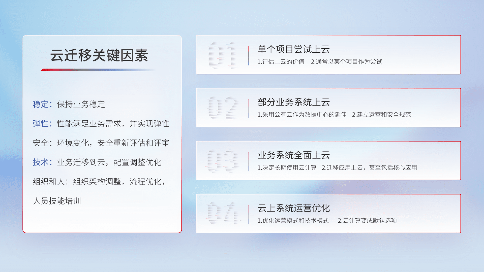 结合实际业务,,从规划设计、、、云平台选型、、、、云原生改造、、数据迁移、、集成交付,,,,迁移全过程为客户识别最佳上云路径,,,做好风险识别管理,,,设计网络架构、、身份权限、、、安全审计合规、、、操作审计、、、、日志审计、、、监控告警策略、、、、多站点容灾设计等,,,对云上基础设施进行整体规划,,提升IT治理水平,,,以满足弹性、、、、高可用、、高性能的需求。。。。